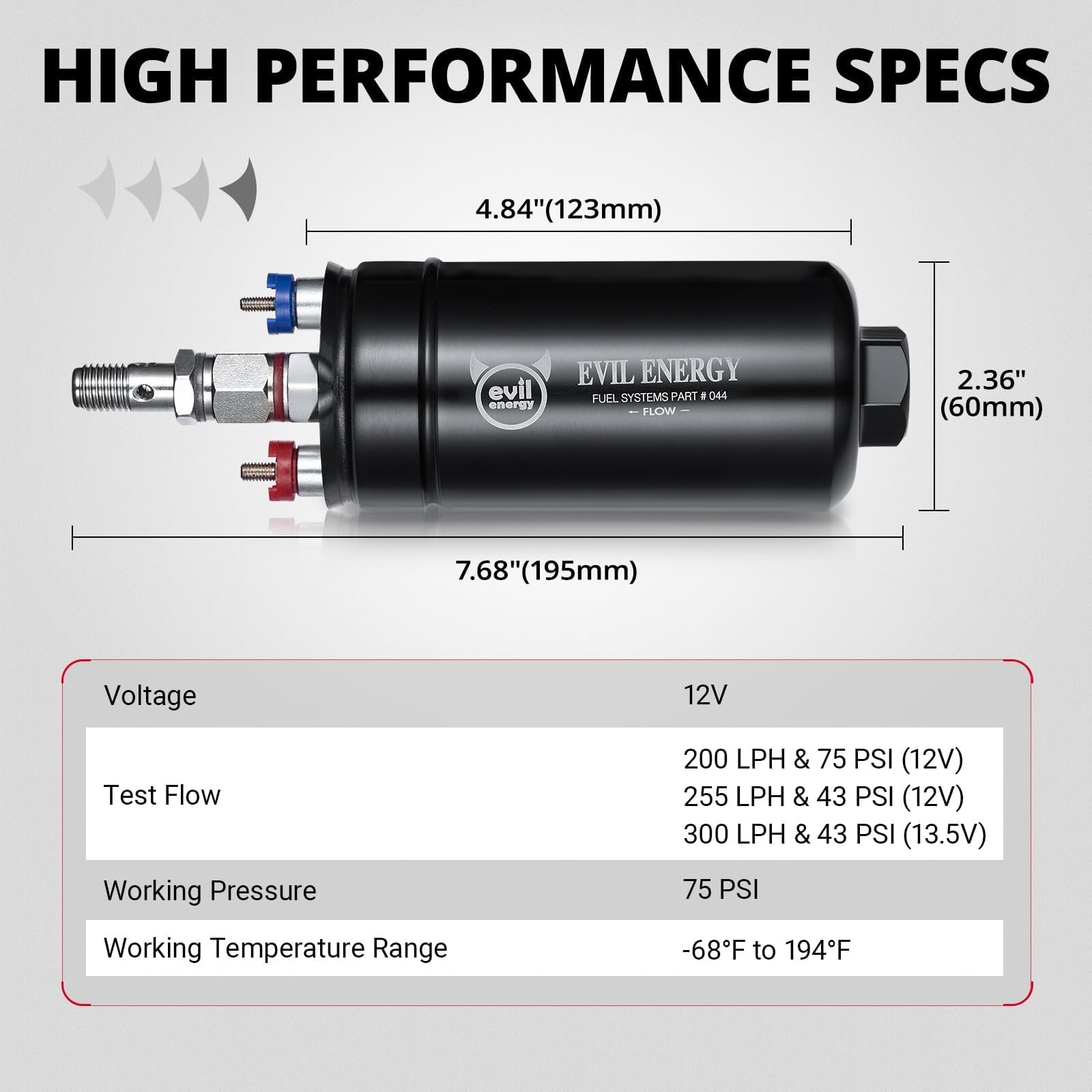 The EVIL ENERGY 12V Fuel Pump kit is a professional-grade solution designed for high-demand EFI Systems. This comprehensive inline electric fuel pump system ensures your engine receives consistent pressure and volume. Whether you are upgrading a racing vehicle or maintaining a heavy-duty setup, this 12V electric fuel pump provides the reliability needed for peak performance. As a high-flow external fuel pump, it is engineered to be mounted outside the tank, making it a versatile fuel inline pump for various custom configurations.