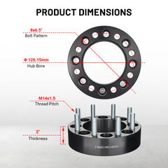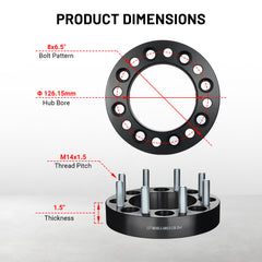 This set comes with four black wheel spacers. They have a PCD of 8x6.5 (165.1mm), a bolt specification of M14x1.5, a center bore of 126.15mm, and each spacer has a thickness of 1.5/2 inches. The sleek black color not only gives a stylish look but also adds a touch of elegance to your vehicle.