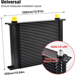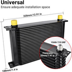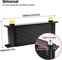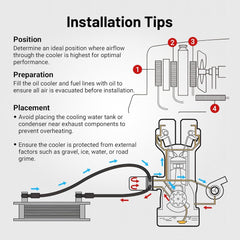 The kit includes 10AN to 8AN/6AN fittings, compatible with common braided fuel line hose ends for flexible routing. Install in a location with good airflow (e.g., front of the radiator) using the included instructions. Note: Some vehicles may require additional accessories (e.g., mounting brackets) for a custom fit—ensure sufficient space for your chosen row size before installation.
