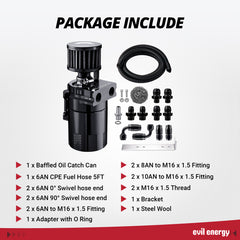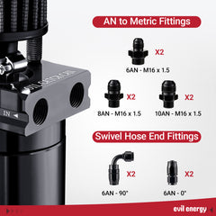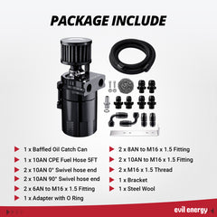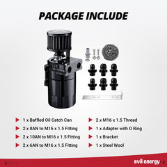 | Without Fuel Line Kit | 1 × Baffled Oil Catch Can 2 × M16 × 1.5 Thread Adapter 2 × 8 AN to M16 × 1.5 Fitting 2 × 10 AN to M16 × 1.5 Fitting 2 × 6 AN to M16 × 1.5 Fitting 1 × Mounting Bracket 1 × Steel Wool Pack 1 × O-Ring Adapter |
