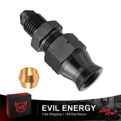 EVIL ENERGY compression fittings convert 1/4", 5/16", or 3/8" OD hardline to 3AN or 6AN male flare. Designed for tight fuel system layouts, they feature an anodized aluminum body and brass ferrule for reliable sealing. Ideal for LS swaps, EFI conversions, or hardline-to-AN retrofits in high-temp engine bays.