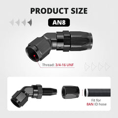 The EVIL ENERGY 45° Low Profile AN Hose End Fitting is engineered for performance fuel systems that demand strength, precision, and space-efficient routing. Its forged 6061-T6 aluminum body delivers superior durability compared to standard welded fittings, while the compact low-profile angle provides easier installation in tight engine compartments. A 37° flare sealing surface and 360° swivel design ensure quick assembly and a secure, leak-free connection—ideal for high-pressure applications up to 1500 PSI. Compatible with both stainless-braided and nylon-braided CPE fuel lines, this fitting is built for fuel, oil, and transmission fluid systems in performance builds, LS swaps, turbo setups, and track-ready vehicles.