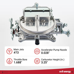 EVIL ENERGY 500 CFM carburetor specifications: Main Jets #73, Accelerator Pump Nozzle 0.028", Throttle Bore 1.688", Carburetor Height 3.25 inches