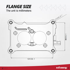 EVIL ENERGY carburetor flange dimension diagram: 131mm length, 88mm width, bolt spacing and bore sizes for easy compatibility check