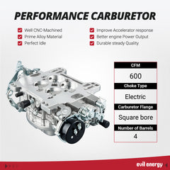 This setup ensures the EVIL ENERGY 600 CFM Carburetor delivers the same compatibility and drivability as premium carb brands—while offering better value and simple installation.
