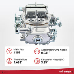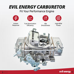 The EVIL ENERGY 650 CFM 4 Barrel Carburetor is engineered for easy installation and reliable street-strip performance. With a single feed fuel inlet and square-bore design, it bolts on effortlessly—no complex tuning required.