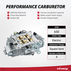 Q1: What is the airflow capacity of the EVIL ENERGY 650 CFM 4-Barrel Carburetor?