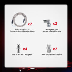 70inch AN6 PTFE Hose *2 90 degree AN6 Female to AN6 Male*4 AN6 to 1/4 NPT Adapter*4 AN6 to 3/8 NPT Adapter*2 AN6 to 1/4 NPS Adapter (Short)*1 AN6 to 1/4 NPS Adapter (Long)*1 |