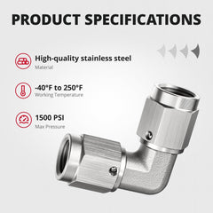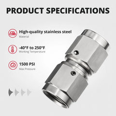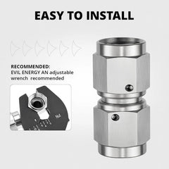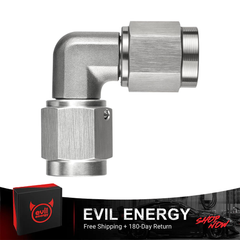 EVIL ENERGY stainless AN female-to-female swivel adapters allow secure 37° flare connections in a straight or 90° layout. Perfect for brake or fuel systems, they’re built from rust-resistant 304 stainless steel and rated to 1,500 PSI. Ideal for high-vibration environments and tight-space routing in performance builds.
