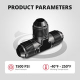 This EVIL ENERGY male flare T-fitting connects three AN lines with a secure 37° seal, perfect for performance fuel or oil systems. Built from anodized 6061 aluminum and rated for 1500 PSI, it’s an ideal solution for LS swaps, EFI upgrades, and turbo setups needing clean, leak-proof routing.