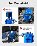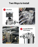 - Modern PCV vehicles: Install inline between PCV hoses as a sealed catch can