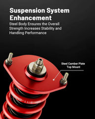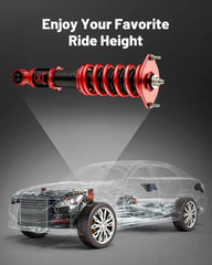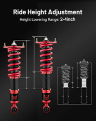 【2 - 4 inches Height Adjustable】- The coil suspension kit reduces the chassis height of the car, allowing you to have a more aggressive stance, which helps eliminate turning noise and improve steering feel and response, enhancing its handling, stability and performance.