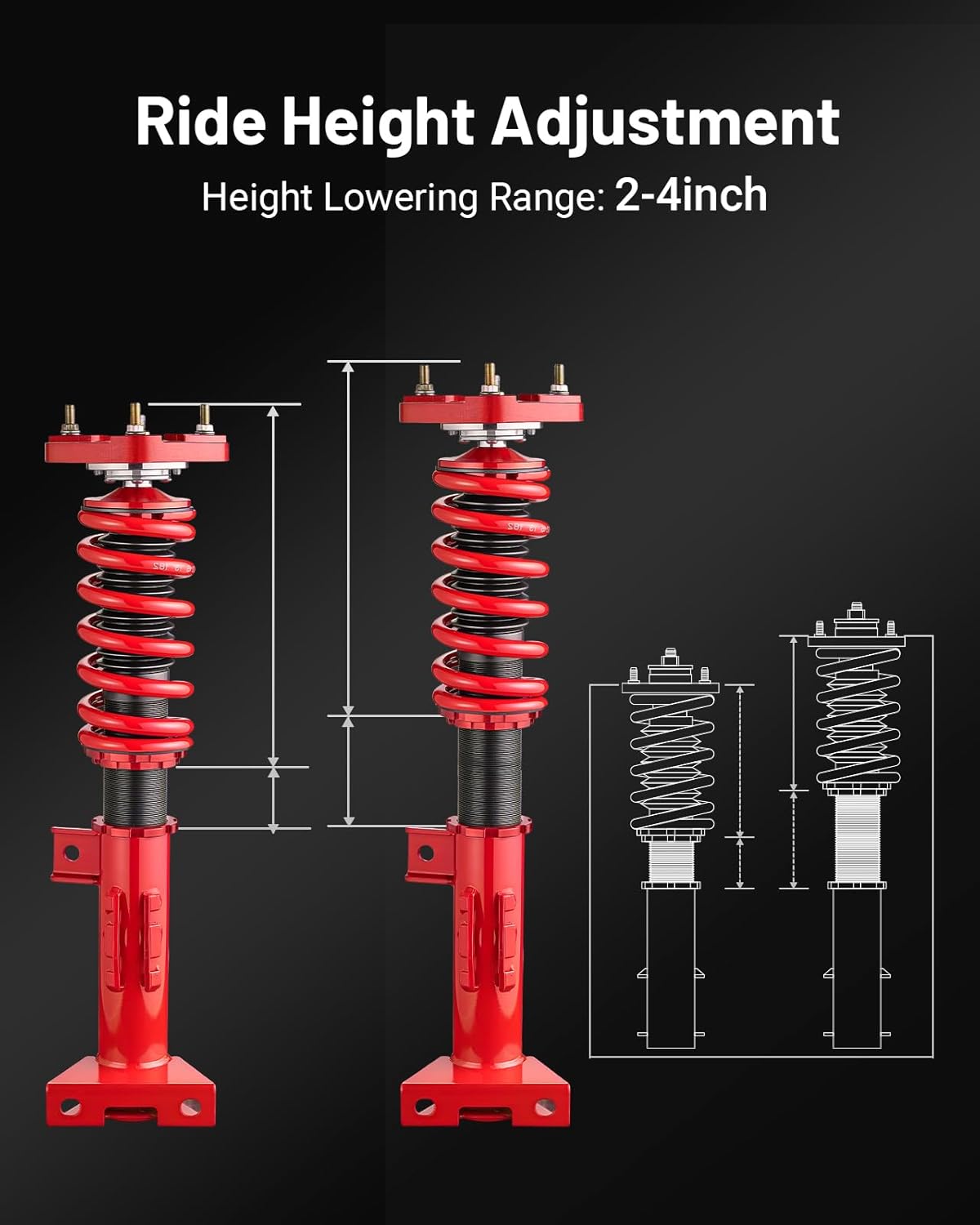 • 【2 - 4 inches Height Adjustable】- The coil suspension kit reduces the chassis height of the car, allowing you to have a more aggressive stance, which helps eliminate turning noise and improve steering feel and response, enhancing its handling, stability and performance.