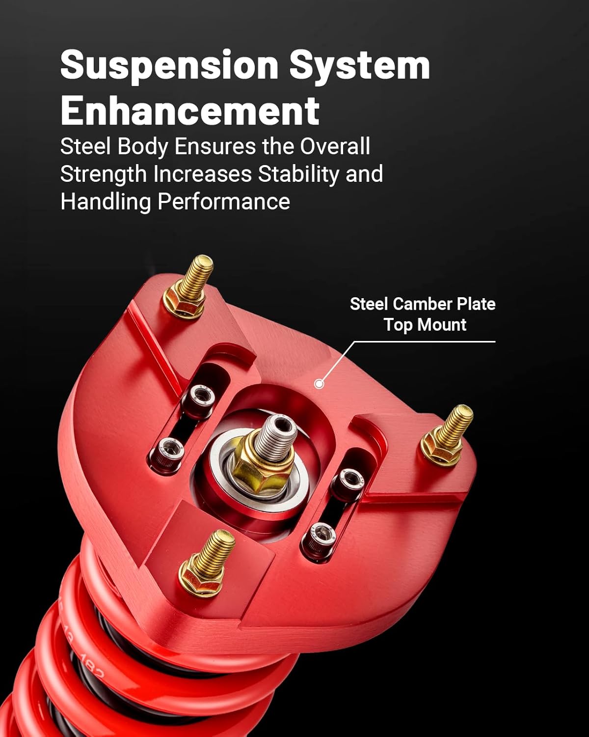 • 【Premium Materials for Superior Quality】- The steel body ensures the overall strength and durability. The camber plate top mount, spring, lower mount, piston rod which are all steel, can maintain a powerful abrasion performance during movement. High quality precision parts, worry-free installation.