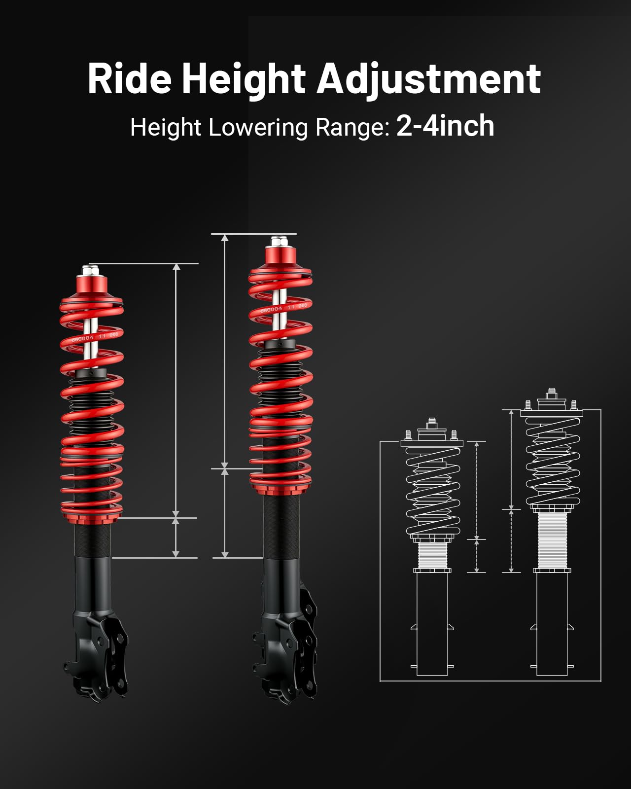 High-rigidity steel springs mean your build won’t sag after a few hard seasons. These Volkswagen coilovers use anti-corrosion coated springs that stay elastic even when you daily the car daily and hit weekend meets. Perfect if you want your stance locked in on MK3 golf coilovers without worrying about tired old stock hardware.