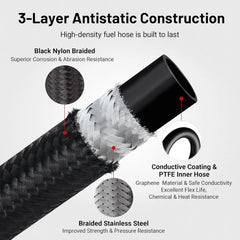 - Antistatic PTFE Fuel Hose: Anti-static, corrosion-resistant, compatible with gasoline, alcohol, E85 and other fuels, flexible and durable.