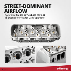 The EVIL ENERGY BBC heads feature 325cc intake runners, 121cc combustion chambers, and optimized valve angles, delivering superior airflow and combustion efficiency. These BBC cylinder heads boost compression, mid-to-high RPM power, and overall performance for street, track, and modified Big Block Chevy builds.