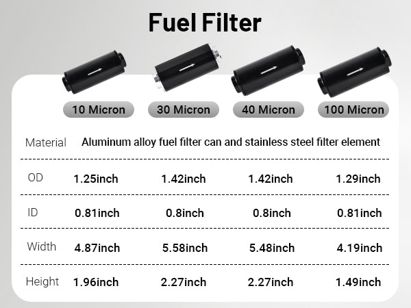 Function: Filters gasoline, diesel, E85, and more. Captures contaminants of 10 microns and above to protect the fuel system.