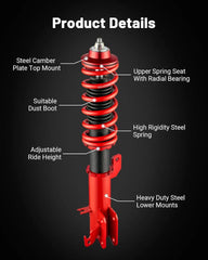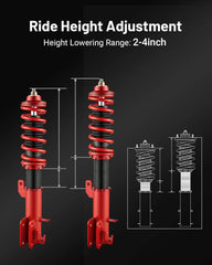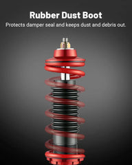 Evil Energy coilovers, compatible with Honda Fit 2009-2014 Year, offer 2-4 inches of adjustable lowering to enhance handling and stability. Featuring durable heat-treated steel springs with 60,000+ cycle life and a twin-tube design for comfort and performance, these coilovers ensure precise camber adjustments and a strong, reliable build with steel components throughout. Professional installation is advised.