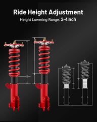 Evil Energy coilovers, compatible with Mitsubishi Eclipse IV (2006-2012) and Galant (2004-2012), offer 2-4 inches of adjustable lowering to enhance handling and stability. Featuring durable heat-treated steel springs with 60,000+ cycle life and a twin-tube design for comfort and performance, these coilovers ensure precise camber adjustments and a strong, reliable build with steel components throughout. Professional installation is advised.