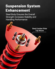 The coil suspension kit reduces the chassis height of the car, allowing you to have a more aggressive stance, which helps eliminate turning noise and improve steering feel and response, enhancing its handling, stability and performance.