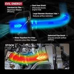 Ideal for enthusiasts upgrading their Jeep Wrangler JK Cold Air Intake, LS intakes, or CAI car builds, the EVIL ENERGY Cold Air Intake is one of the best air intake solutions, combining cold air induction kit design with premium materials for lasting performance, reliability, and style.