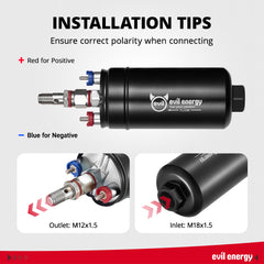 - Designed for 12V DC EFI systems, this pump is compatible with gasoline, diesel, E85, and more. Installing it below the tank ensures gravity-fed fuel delivery. Installation instructions included.