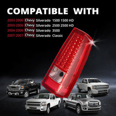 The tail light assembly is compatible for 1999-2002 Chevy Silverado 1500/ 1500 HD,1999-2002 Chevy Silverado 2500/ 2500 HD,2001-2003 Chevy Silverado 3500,1999-2006 GMC Sierra 1500/ 1500 HD,1999-2006 GMC Sierra 2500/ 2500 HD,2001-2006 GMC Sierra 3500,2007-2007 GMC Sierra Classic(2-Door Regular Cab | 3/4-Door Extra Cab | 4-Door Crew Cab). Attention: Fit for fleetside models only, NOT for models with stepside beds.