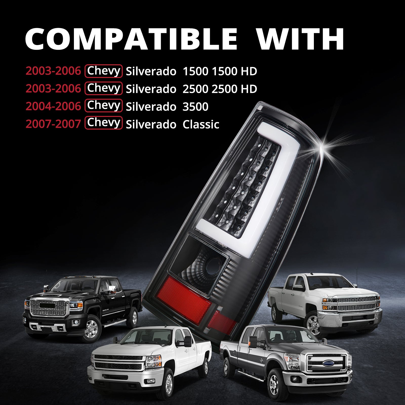 The tail light assembly is compatible for 2003-2006 Chevy Silverado 1500 1500 HD, 2003-2006 Chevy Silverado 2500 2500 HD, 2004-2006 Chevy Silverado 3500, 2007-2007 Chevy Classic, but NOT for 2007 Classic 3500HD Model. Attention: Fit for fleetside models only, NOT for models with stepside beds.