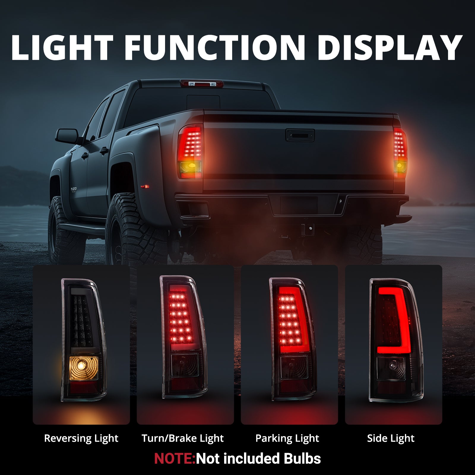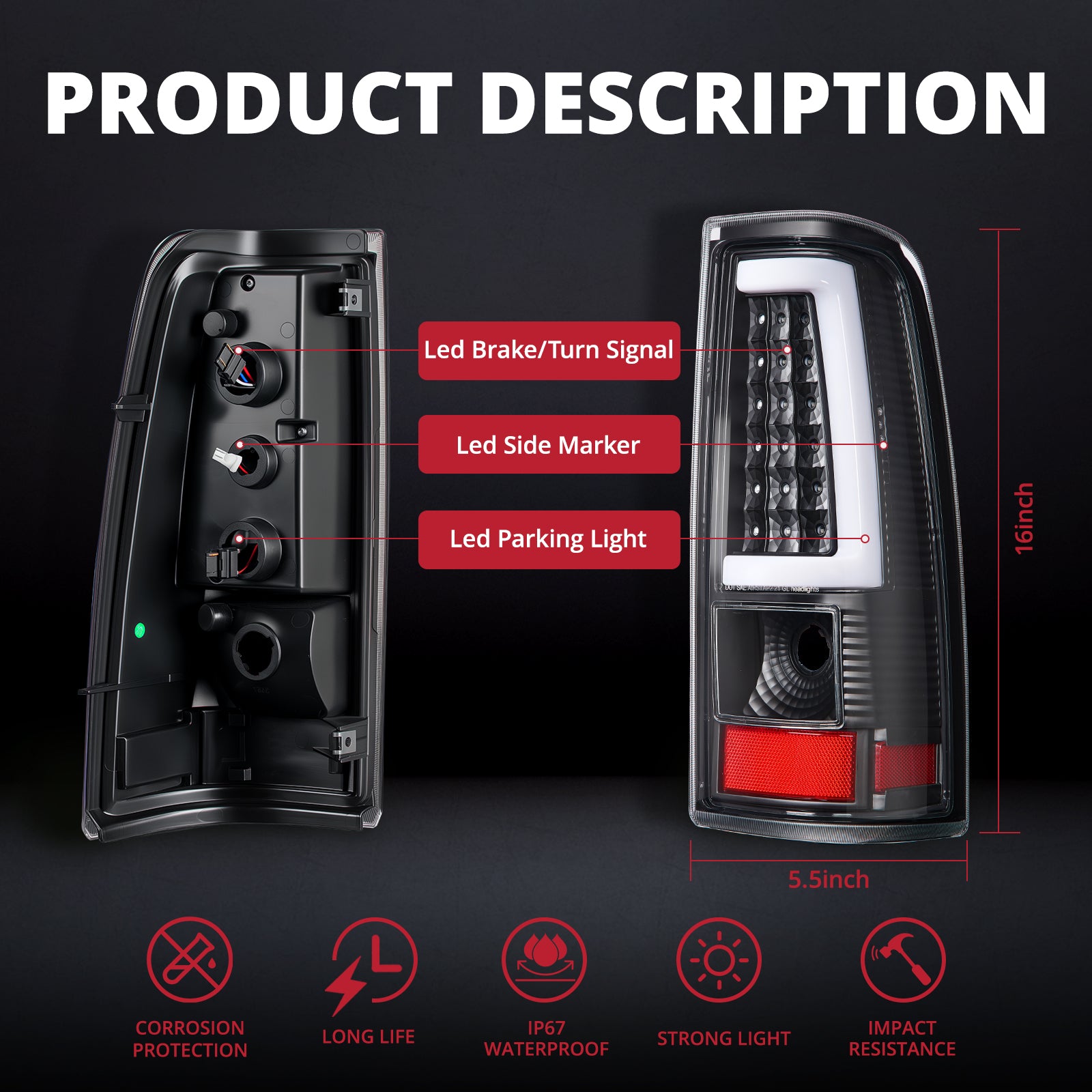 It’s a pair of tail light assembly that is as tough as your truck to deal with any harsh environment. Due to the completely sealed structure with silicone and a one-way moisture-resistant vent, the taillight keeps dust and water out and withstands rain, snow, sleet, and car washes. Prevent internal condensation and fogging in extreme weather.
