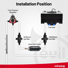 The inline fuel filter captures particles down to 40 microns, protecting your EVIL ENERGY fuel pump and injectors from contaminants.