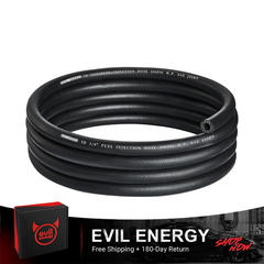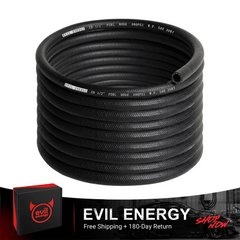 The EVIL ENERGY SAE 30R9 Fuel Injection Hose is built for modern EFI and LS swap fuel systems. Featuring an FKM inner layer, aramid reinforcement, and ECO outer cover, it resists ethanol blends (E85, E10, diesel) and handles up to 300 PSI. Designed for use in fuel lines, filters, pumps, and tanks, it offers reliable performance in high-temperature, high-pressure environments. Available in 1/4", 5/16", and 3/8" sizes with multiple length options.