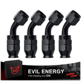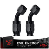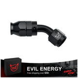 The EVIL ENERGY 45° AN PTFE Hose End Fitting is designed for high-performance fuel and fluid systems. With a 37° flare sealing design and 360° swivel, it delivers a leak-free, secure connection while allowing flexibility in tight installation spaces. Built from lightweight 6061-T6 aluminum and anodized in black, this fitting ensures corrosion resistance and durability under extreme conditions. Perfect for E85, alcohol, nitrous, oiling, and hydraulic systems.