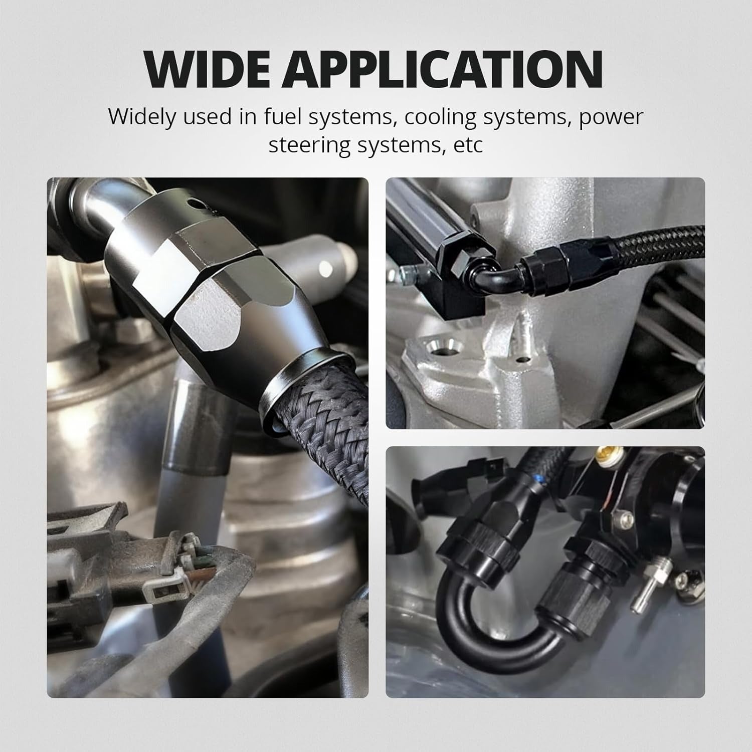 EVIL ENERGY PTFE Hose End Fittings provide a secure, leak-free solution for high-pressure fuel systems, boosted engines, and ethanol-compatible builds. Designed exclusively for PTFE fuel lines, these fittings utilize a 37° flare seal and a 360° swivel body to simplify installation and ensure precise alignment. Built from 6061-T6 anodized aluminum, they withstand up to 1500 PSI and extreme temperatures, making them ideal for performance fuel systems, oil lines, transmission applications, and custom engine plumbing. Available in multiple angles to deliver flexible routing solutions for tight engine bays and custom layouts.