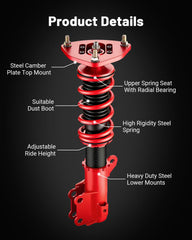【Premium Materials for Superior Quality】- The steel body ensures the overall strength and durability. The camber plate top mount, spring, lower mount, piston rod which are all steel, can maintain a powerful abrasion performance during movement. High quality precision parts, worry-free installation.