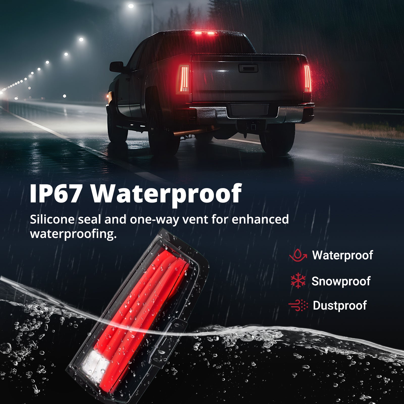 The IP67 rating ensures this LED tail lights assembly is built for tough conditions with a fully sealed housing and silicone gasket. A one-way moisture vent protects against dust, water, and fog, ensuring reliable performance in rain, snow, and extreme weather.