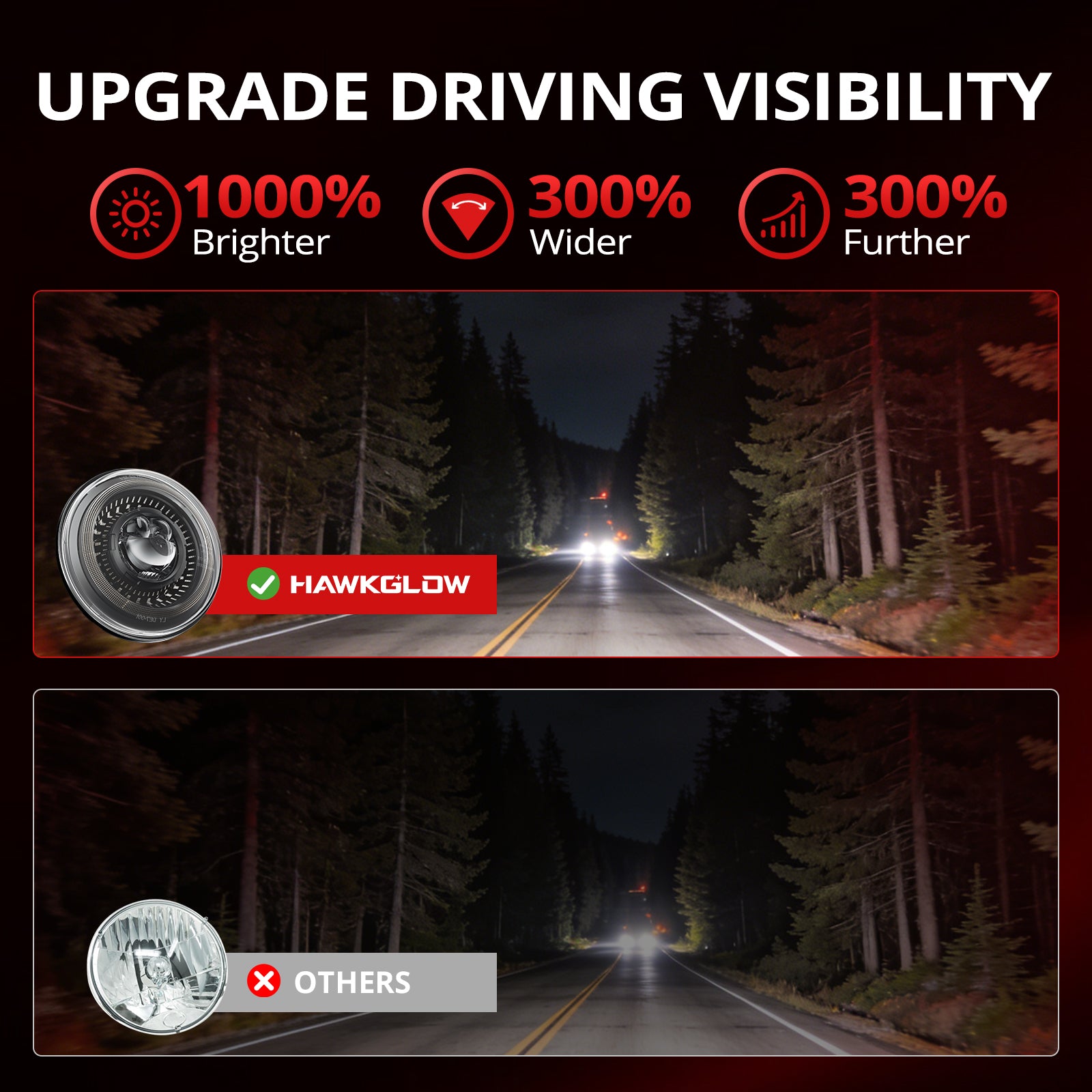 Modern Look, 1000% Super bright ,6000lm/3000lm high/low beam/pcs; Best beam pattern on the market: Uniform Light, no blind Area and dim spots;Very Sturdy:6.17 lb/pair;