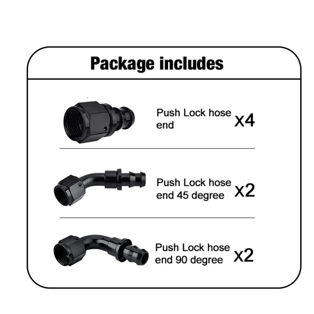The EVIL ENERGY Push Lock Hose End Fitting Kit (8PCS) is designed for high-performance fuel system upgrades. Featuring multiple angles for versatile routing, these fittings ensure smooth fuel flow and prevent line kinks.