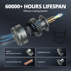 EVIL ENERGY’s RD09 bullet seriers automotive led headlight bulbs feature advanced cooling with copper tubes for rapid heat transfer, CNC-machined aluminum housing for durability, and a high-speed cooling fan to prevent overheating. These technologies ensure the 360° LED headlight bulbs last over 60,000 hours of reliable performance.