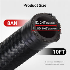 6AN ID: 5/16". OD: 0.465inch. 8AN ID: 13/32". OD: 0.543inch |